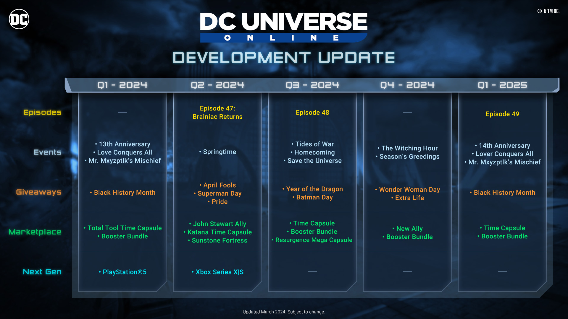 Keep reading to see some of the big things we're bringing to DCUO in 2024 and beyond. What follows are our plans laid out as transparently as possible based what we know or expect to be true – as of right now.